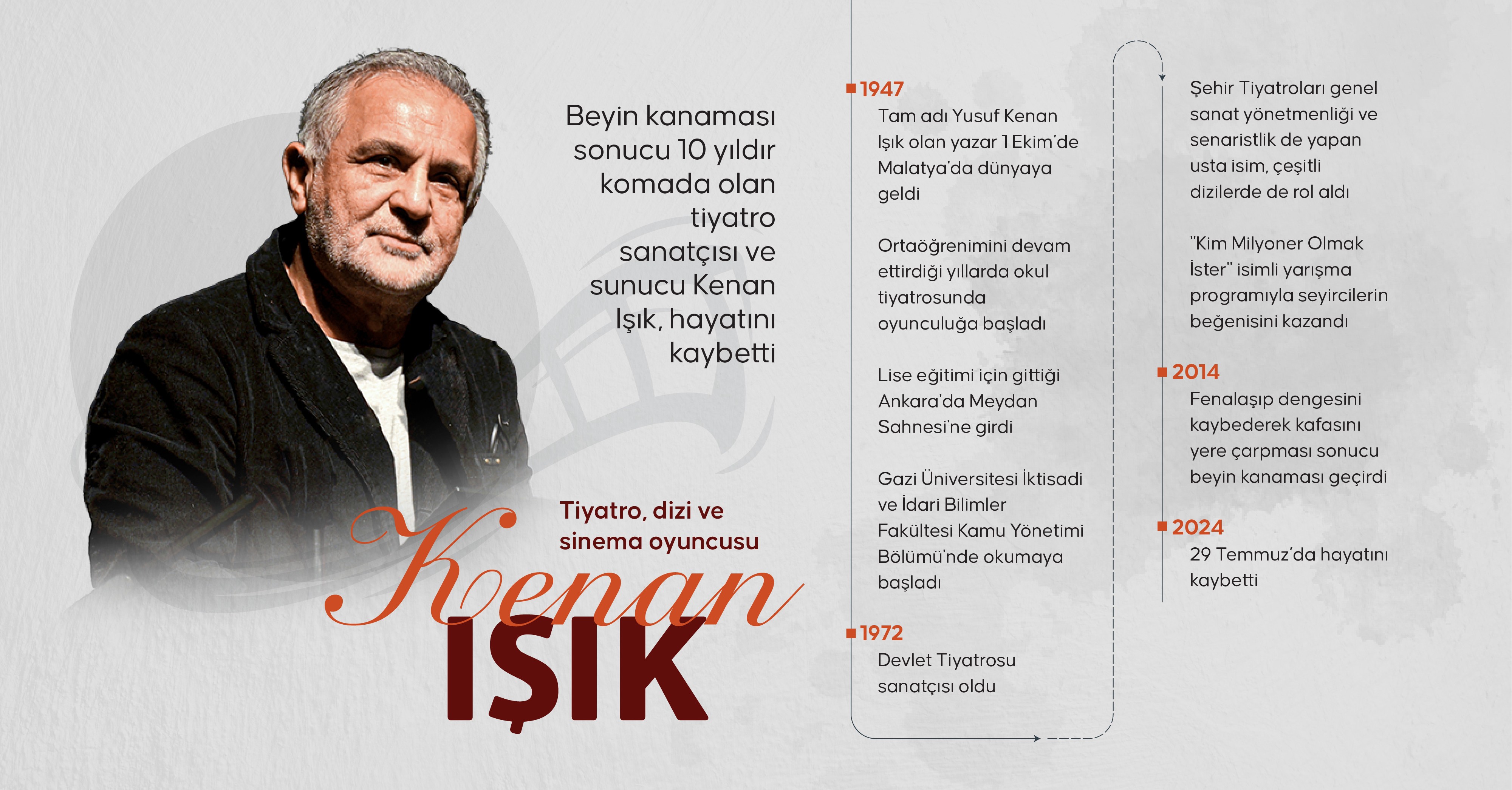 İstanbul, 29 Temmuz 24 (TAK): Beyin kanaması sonucu 10 yıldır komada olan oyuncu Kenan Işık 76 yaşında vefat etti.