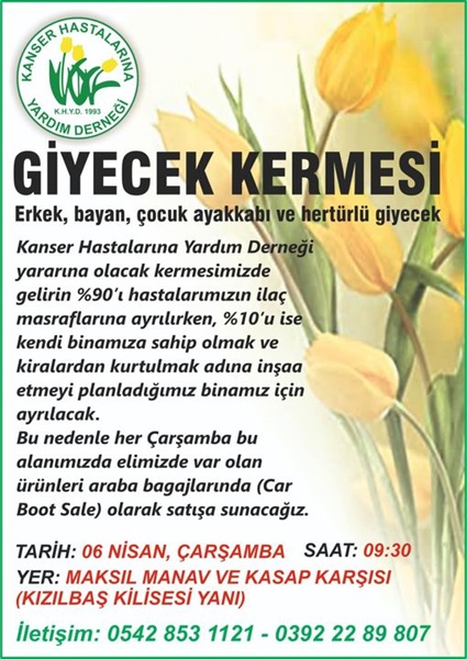 Lefkoşa, 4 Nisan 22 (TAK): Kanser Hastalarına Yardım Derneği (KHYD), “1-7 Nisan Kanser Haftası” etkinlikleri çerçevesinde çarşamba günü Lefkoşa’da giyecek kermesi düzenleyecek.