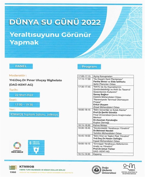 Lefkoşa, 21 Mart 22 (TAK): KTMMOB ile DAÜ Kentsel Araştırma ve Geliştirme Merkezi işbirliğinde BM nezdinde her yıl organize edilen “Uluslararası Dünya Su Günü” kapsamında “Yeraltısuyunu Görünür Yapmak” başlığı altında panel düzenleneceği açıklandı.