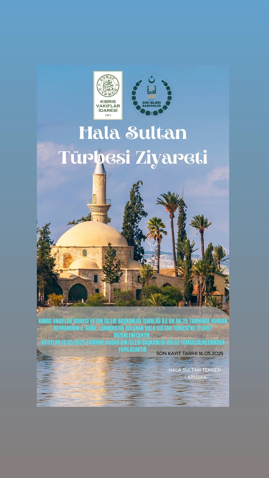 Lefkoşa, 9 Mayıs 25 (TAK): Kurban Bayramı dolayısıyla Larnaka’daki Hala Sultan Türbesi’ne ziyaret düzenlenecek.