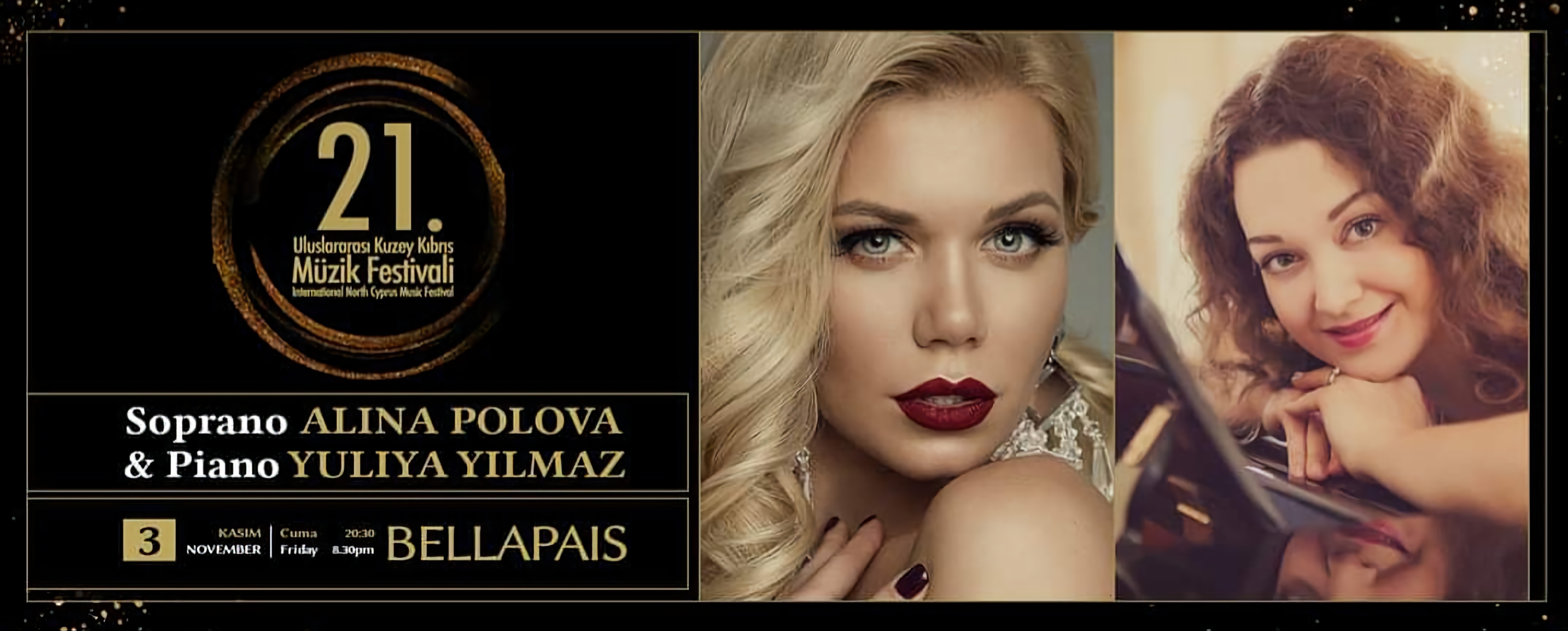 Lefkoşa, 2 Kasım 23 (TAK): Kuzey Kıbrıs Müzik Derneği' nin organizasyonunda bu yıl 21’incisi gerçekleştirilen Uluslararası Kuzey Kıbrıs Müzik Festivali soprano Alina Polova ve piyanist Yuliya Yılmaz konseri ile devam ediyor.