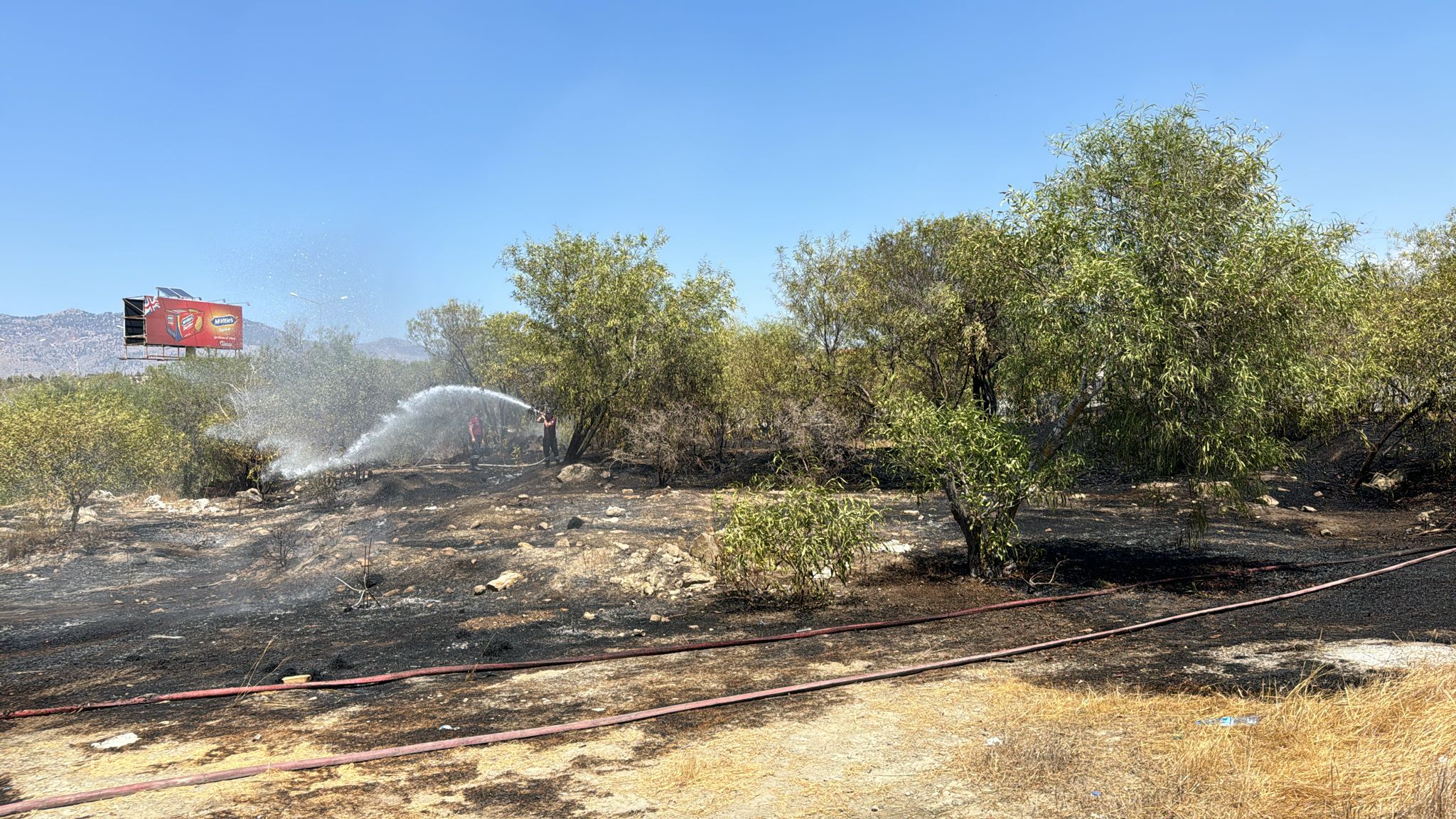 Lefkoşa, 8 Ağustos 24 (TAK): Lefkoşa-Girne ana yolunda çıkan yangında ağaçlar zarar gördü.