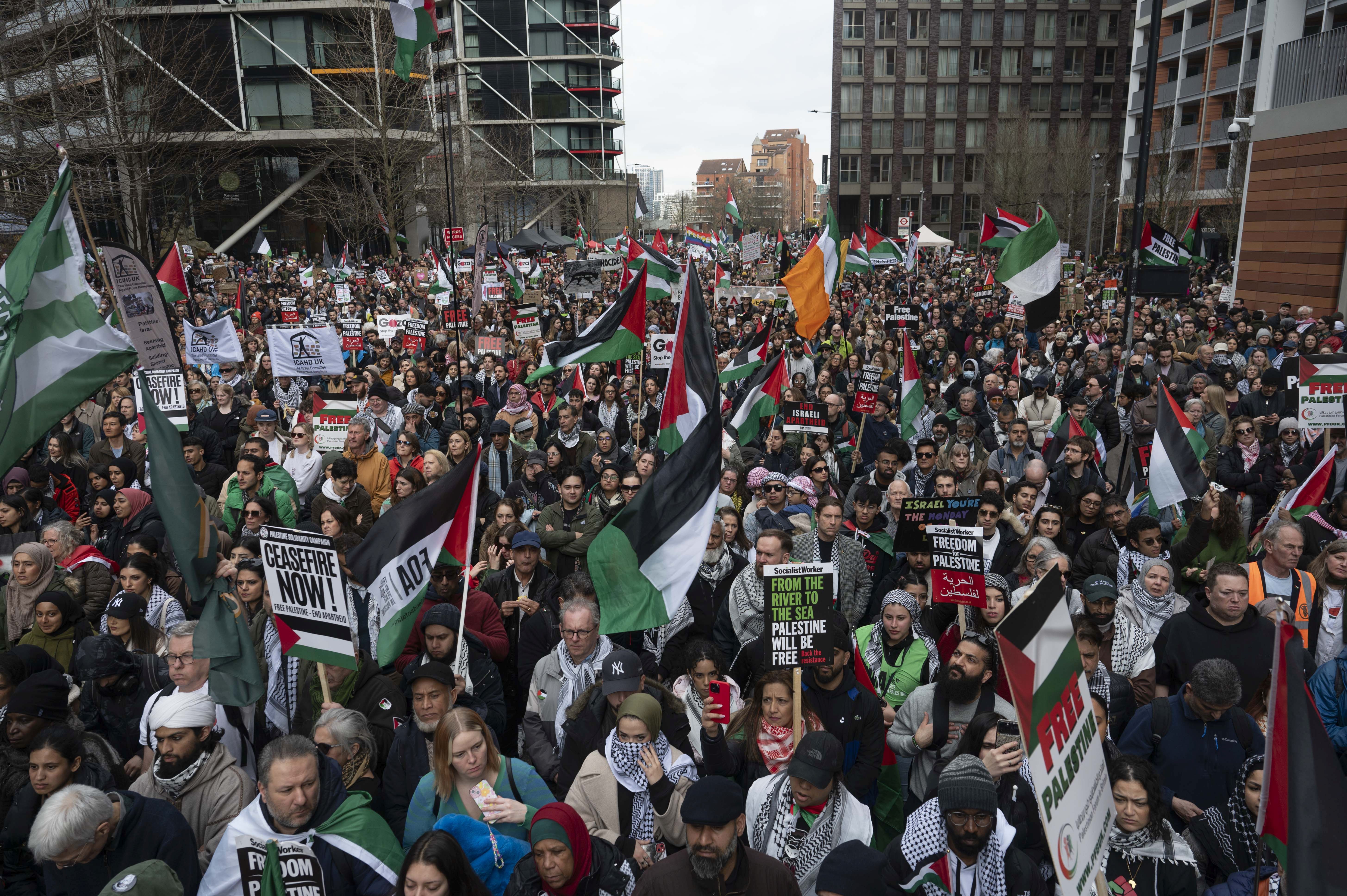 Londra, 9 Mart 24 (TAK): İngiltere'nin başkenti Londra'da on binlerce kişi, Gazze'de acil ateşkes ve Filistin halkıyla dayanışma göstermek için tekrar sokaklara döküldü.