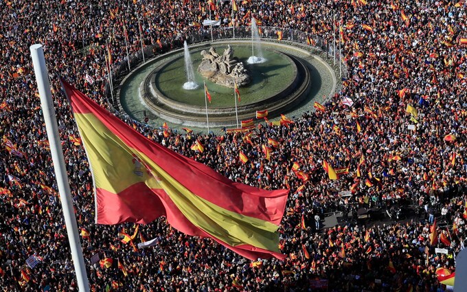 Madrid, 19 Kasım 23 (TAK): İspanya'nın başkenti Madrid'de binlerce İspanyol, Sosyalist İşçi Partisinin (PSOE) Meclis'e sunduğu, ayrılıkçı Katalanlara af getirilmesini içeren yasa tasarısını protesto etti.