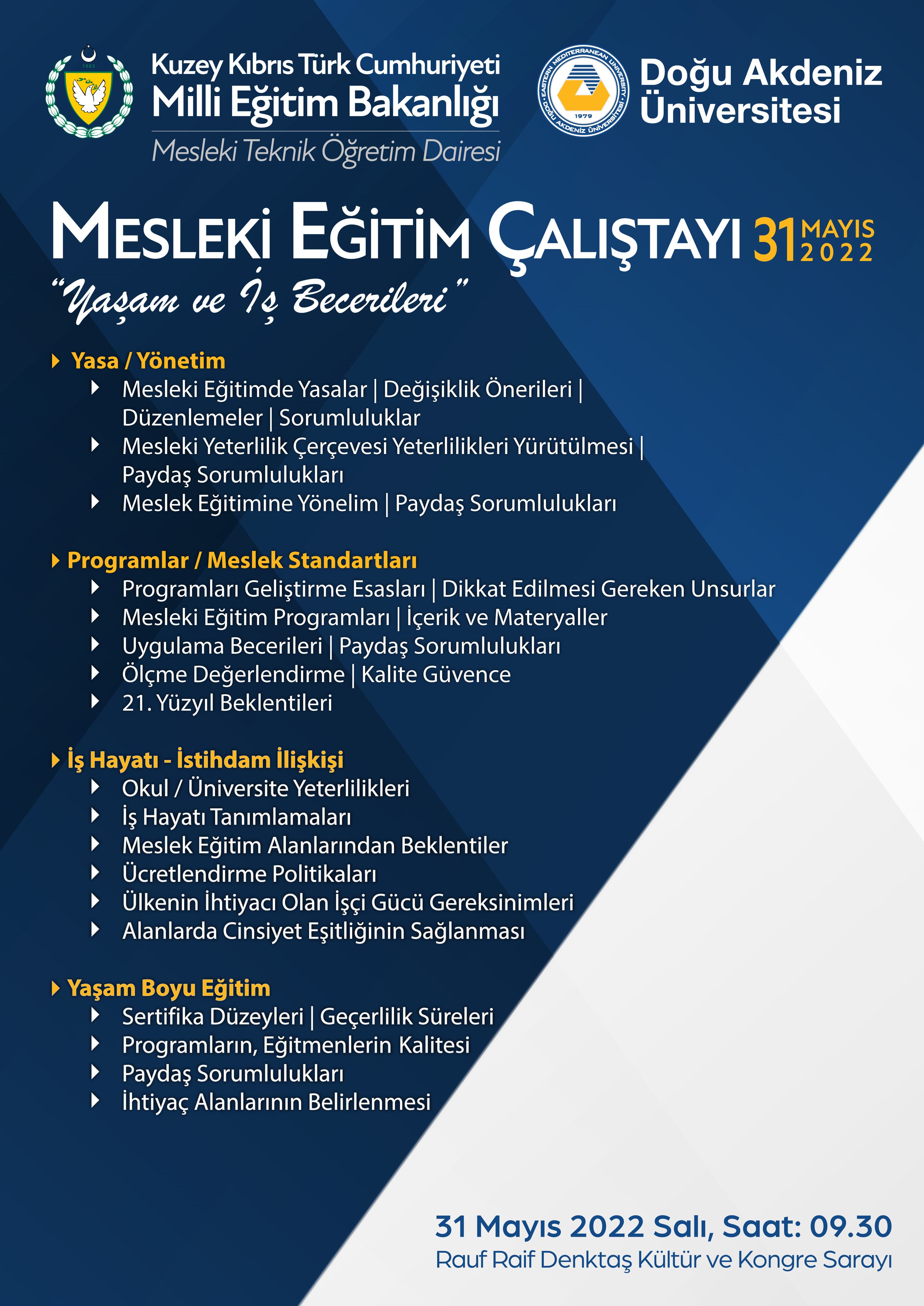 Lefkoşa, 24 Mayıs 22 (TAK): Milli Eğitim Bakanlığı’na bağlı Mesleki Teknik Öğretim Dairesi ile Doğu Akdeniz Üniversitesi (DAÜ) iş birliğinde “Mesleki Eğitim Çalıştayı” düzenleniyor.