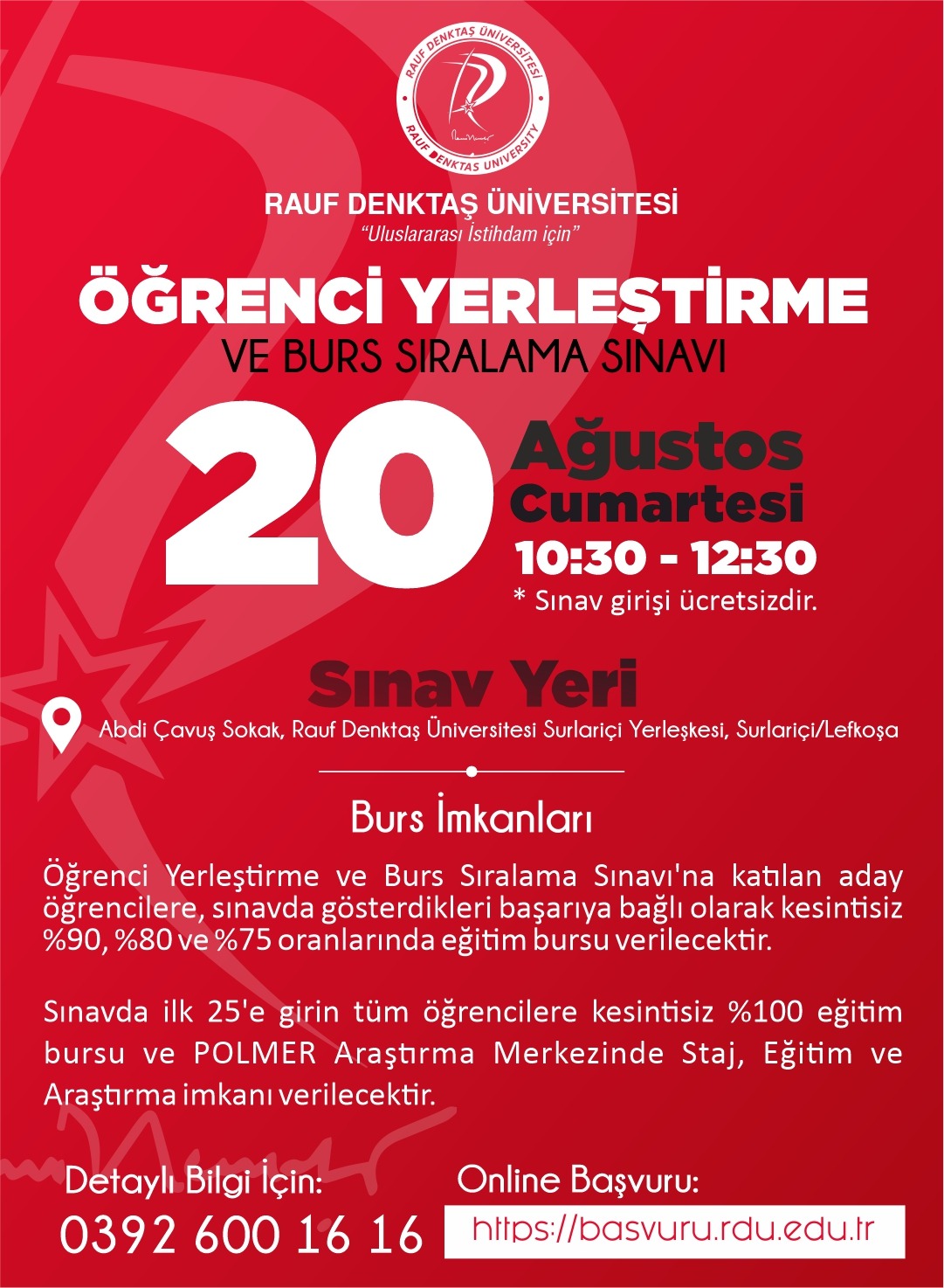 Lefkoşa, 15 Ağustos 22 (TAK): Rauf Denktaş Üniversitesi’nin (RDÜ) yerleştirme ve burs sınavı 20 Ağustos’ta yapılacak.