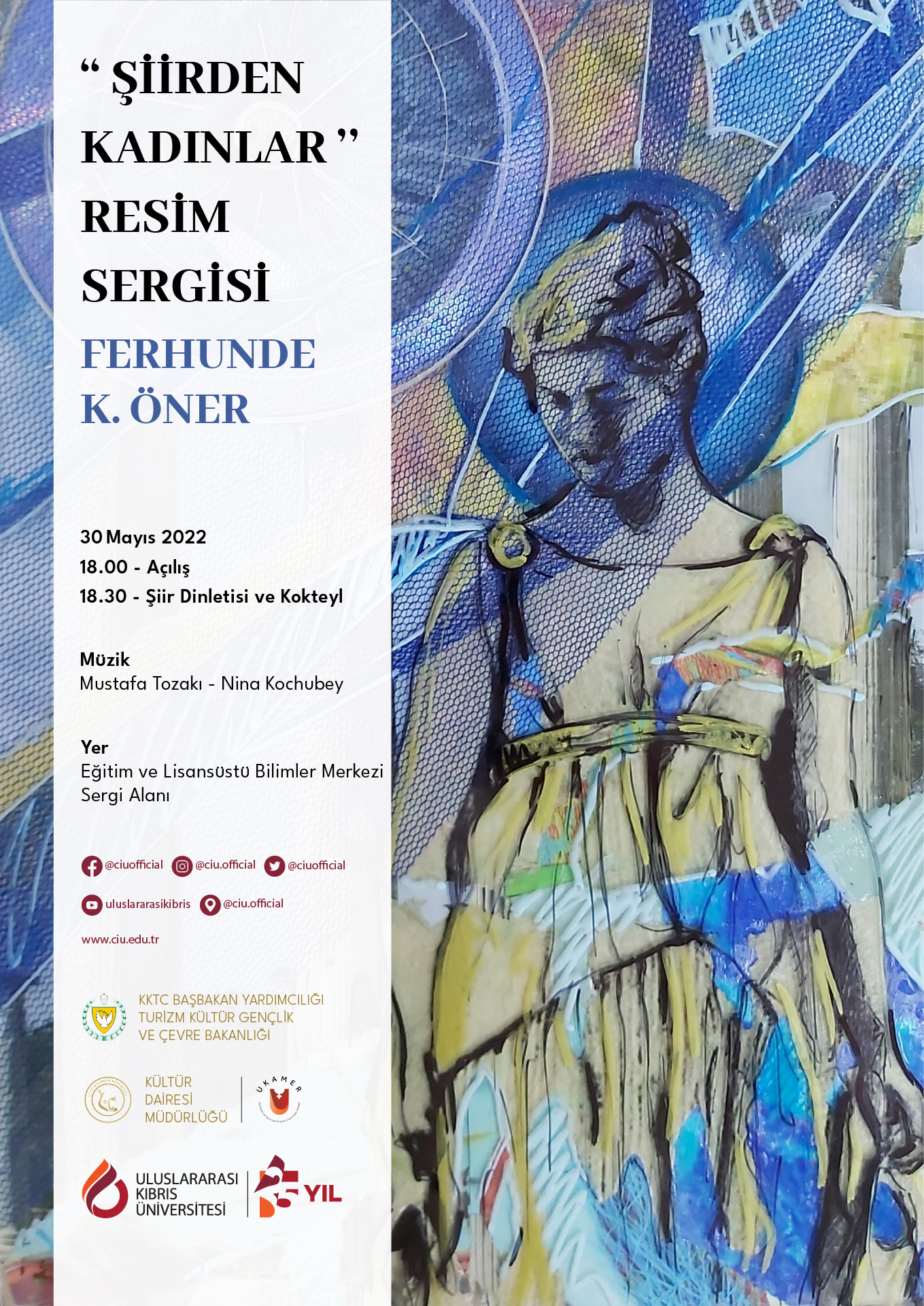 Lefkoşa, 27 Mayıs 22 (TAK): Kültür Dairesi, Uluslararası Kıbrıs Üniversitesi ile Uluslararası Kıbrıs Üniversitesi Kadın ve Toplumsal Cinsiyet Araştırmaları Merkezi işbirliğinde, Ressam Ferhunde K. Öner’in “Şiirden Kadınlar” isimli resim sergisi UKÜ’de açılıyor.