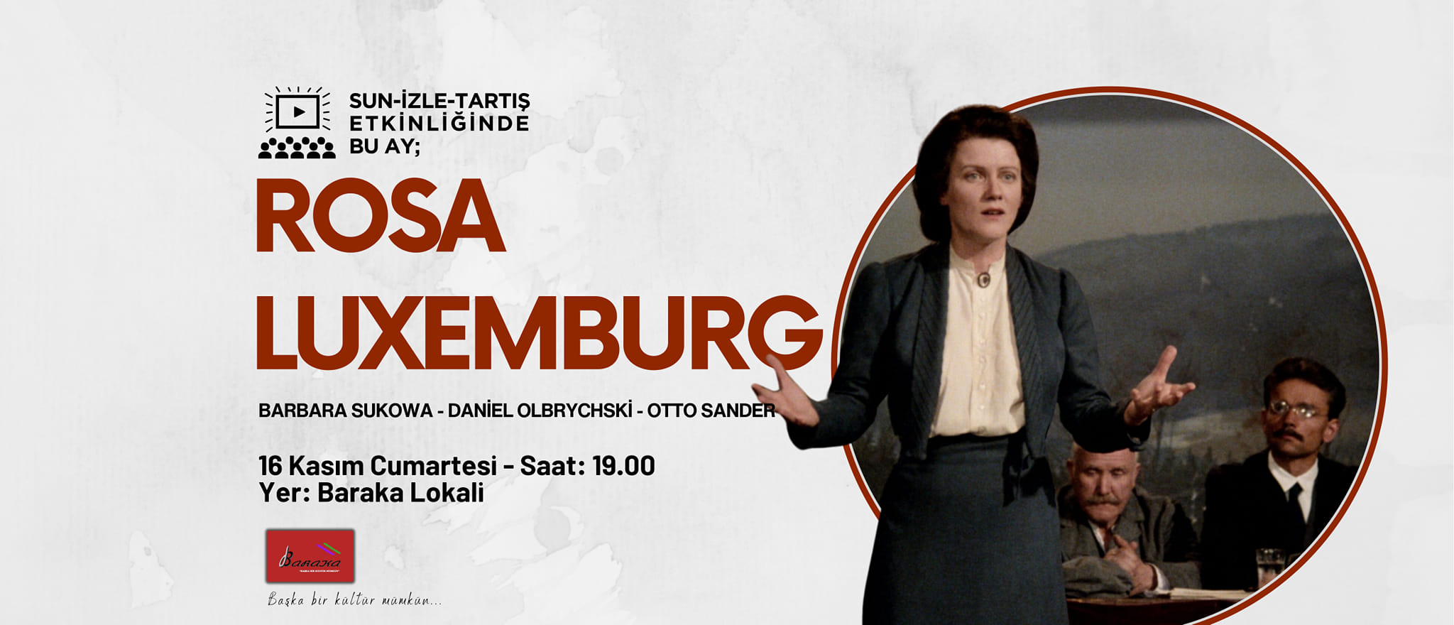 Lefkoşa, 12 Kasım 24 (TAK): Baraka Kültür Merkezi tarafından düzenlenen “Sun İzle Tartış” etkinliklerinde bu ay “Rosa Luxemburg” filmi izlenecek.
