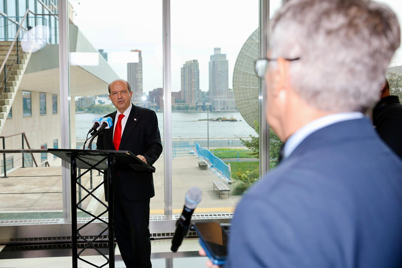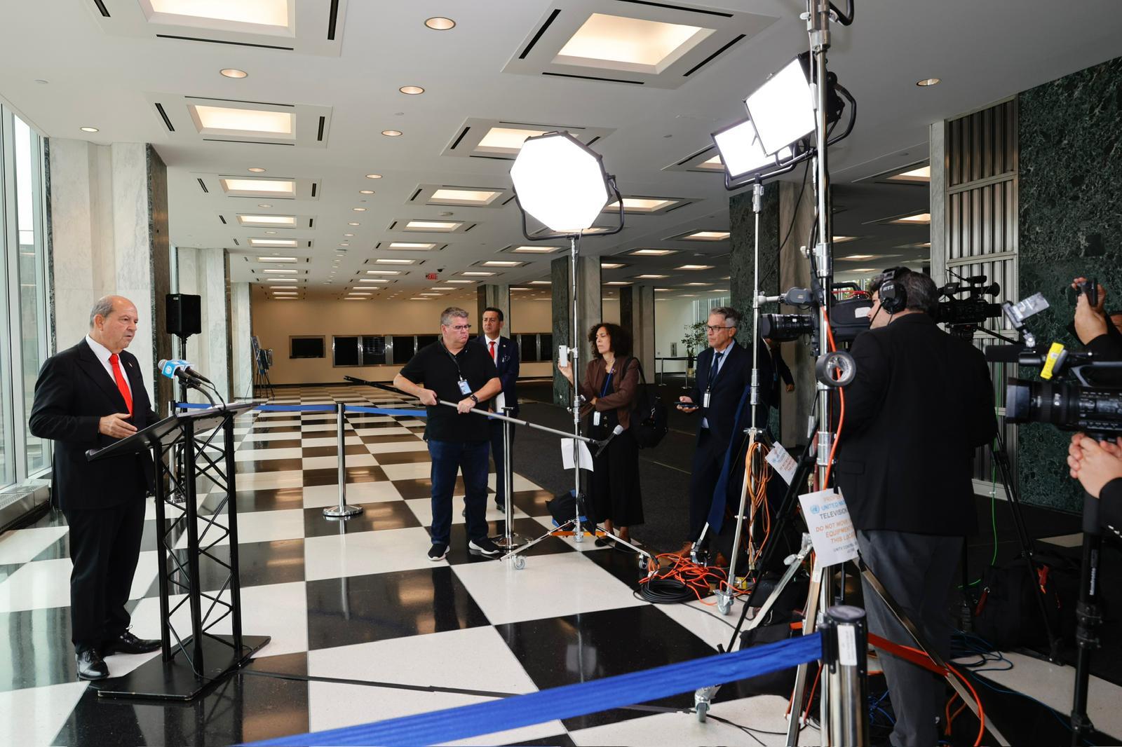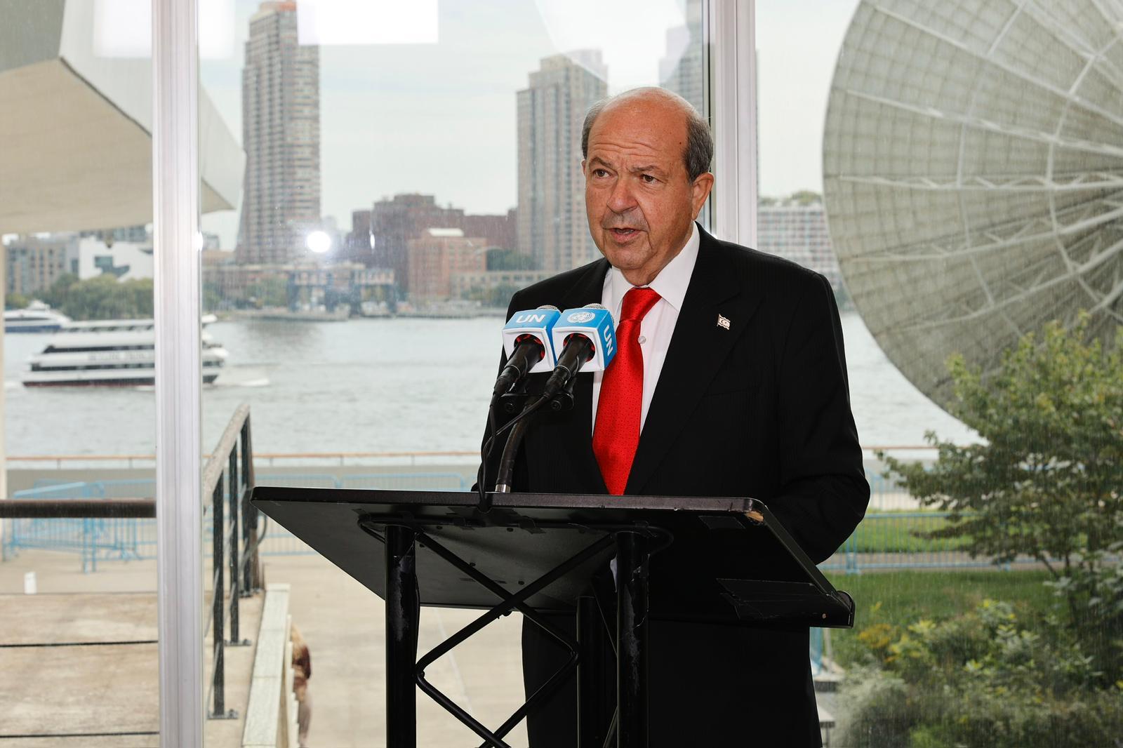 Lefkoşa, 27 Eylül 25 (TAK): Cumhurbaşkanı Ersin Tatar, BM Genel Sekreteri António Guterres’in ev sahipliğinde Rum liderin de katılımıyla New York’ta yapılan üçlü görüşmede Kıbrıs Türk tarafının vizyonunu bir kez daha ortaya koyduğunu belirterek, “Federal çözüm denemeleri artık geride kalmıştır. Çözümün yolu, egemen eşitlik ve eşit uluslararası statüye dayalı, yan yana yaşayan iki devlettir” dedi.