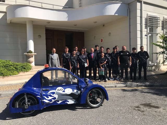 Lefkoşa, 22 Eylül 22 (TAK): Türkiye Cumhuriyeti Lefkoşa Büyükelçisi Ali Murat Başçeri, Türkiye’de düzenlenen TEKNOFEST 2022’de “İlke” isimli araçları ile Uluslararası Efficiency Challenge Elektrikli Araç Yarışları ve Liseler Arası Efficiency Challenge Elektrikli Araç Yarışları’nda birincilik elde eden Sedat Simavi Endüstri Meslek Lisesi (SSEML) öğrencilerini kabul etti.