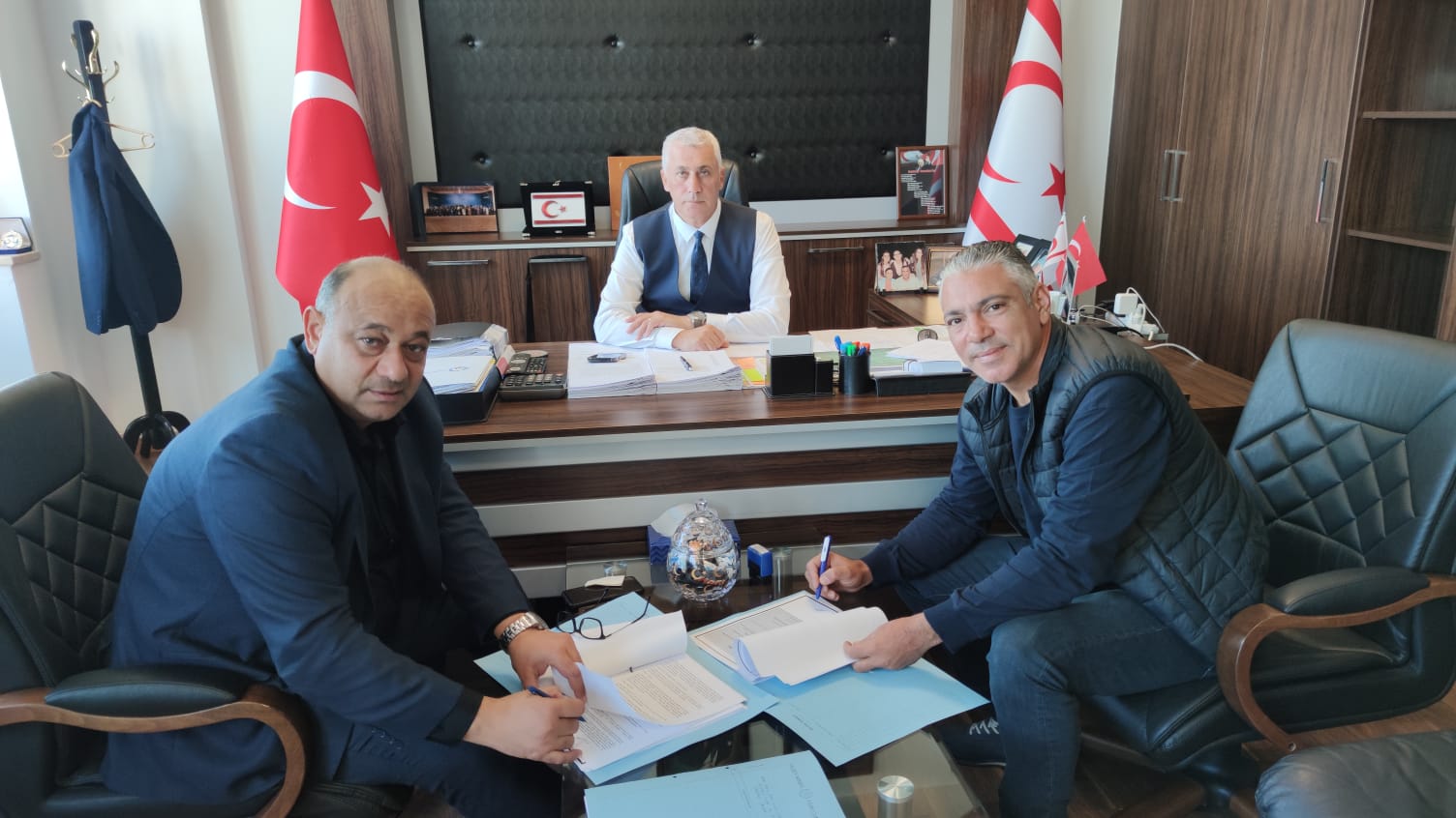Lefkoşa, 27 Kasım 23 (TAK): Ekonomi ve Enerji Bakanlığı Sanayi Dairesi ile Denko Kum Çakıl İşletmeleri Limited Şirketi arasında, Vadili Küçük Esnaf Sanayi Sitesi’ne içme ve kullanım suyu temini ve tamiratı projesi sözleşmesi imzalandı.