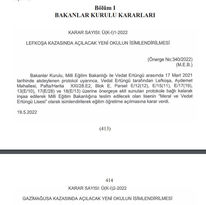 Lefkoşa, 21 Mayıs 22 (TAK): Lefkoşa’da iki, Gazimağusa’da da bir okulun isimleri Bakanlar Kurulu’nca belirlendi.